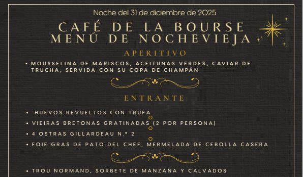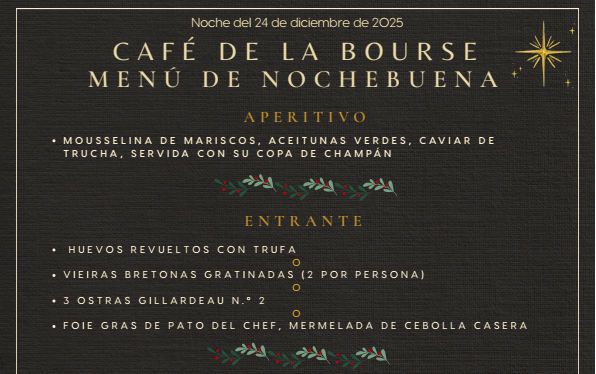 - Menu de Navidad 2025El 25 de diciembre, la fiesta continua en Café de la Bourse. Encontrareis aqui los 2 menus que ofrecemos.